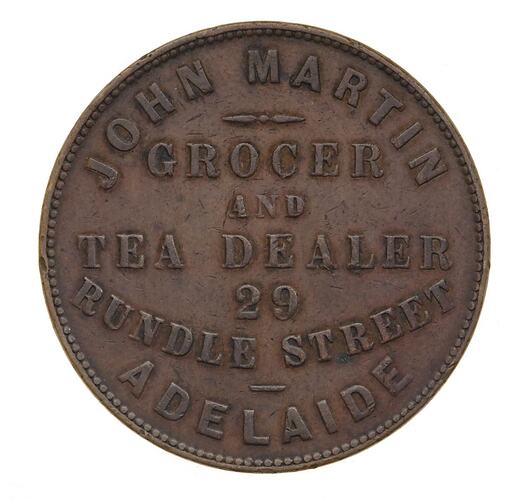 The earliest listing of a business exactly matching the inscription on the tokens ('JOHN MARTIN / GROCER / AND / TEA DEALER / 29 / RUNDLE STREET / ADELAIDE') was in 1858, in 'Howell's Directory for the City and Port of Adelaide'. The Museum Victoria Catalogue gives 1858 as the most likely year for the issue of Martin's tokens. In 1864 the only listing for a John Martin was for Sturt Street, Adelaide. This listing continued until 1867. No advertisements for the business were located during this survey.
