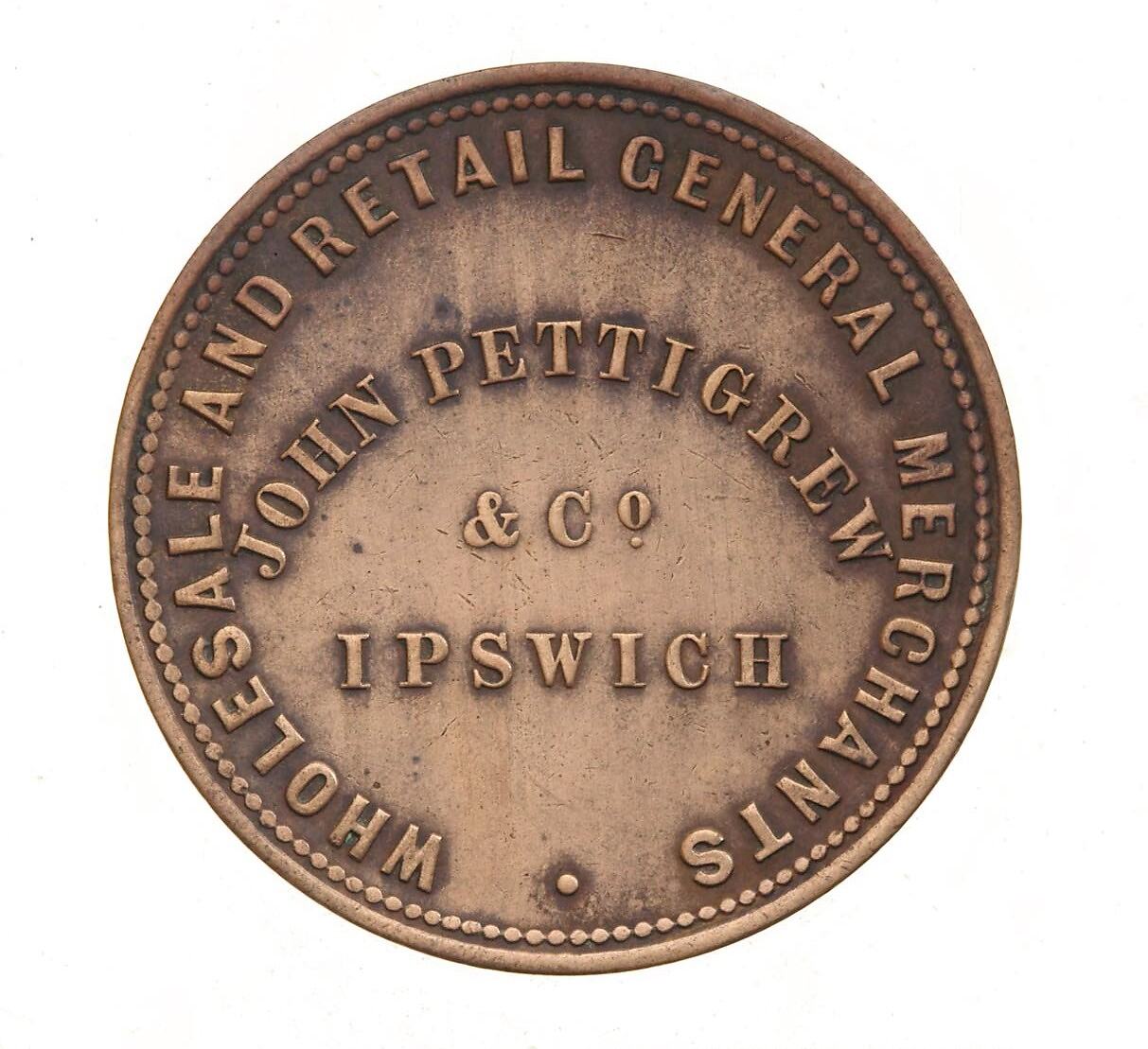 John Pettigrew & Co. issued one variety of penny tokens and one variety of halfpenny tokens in 1865. The tokens were struck by W.J. Taylor of London.