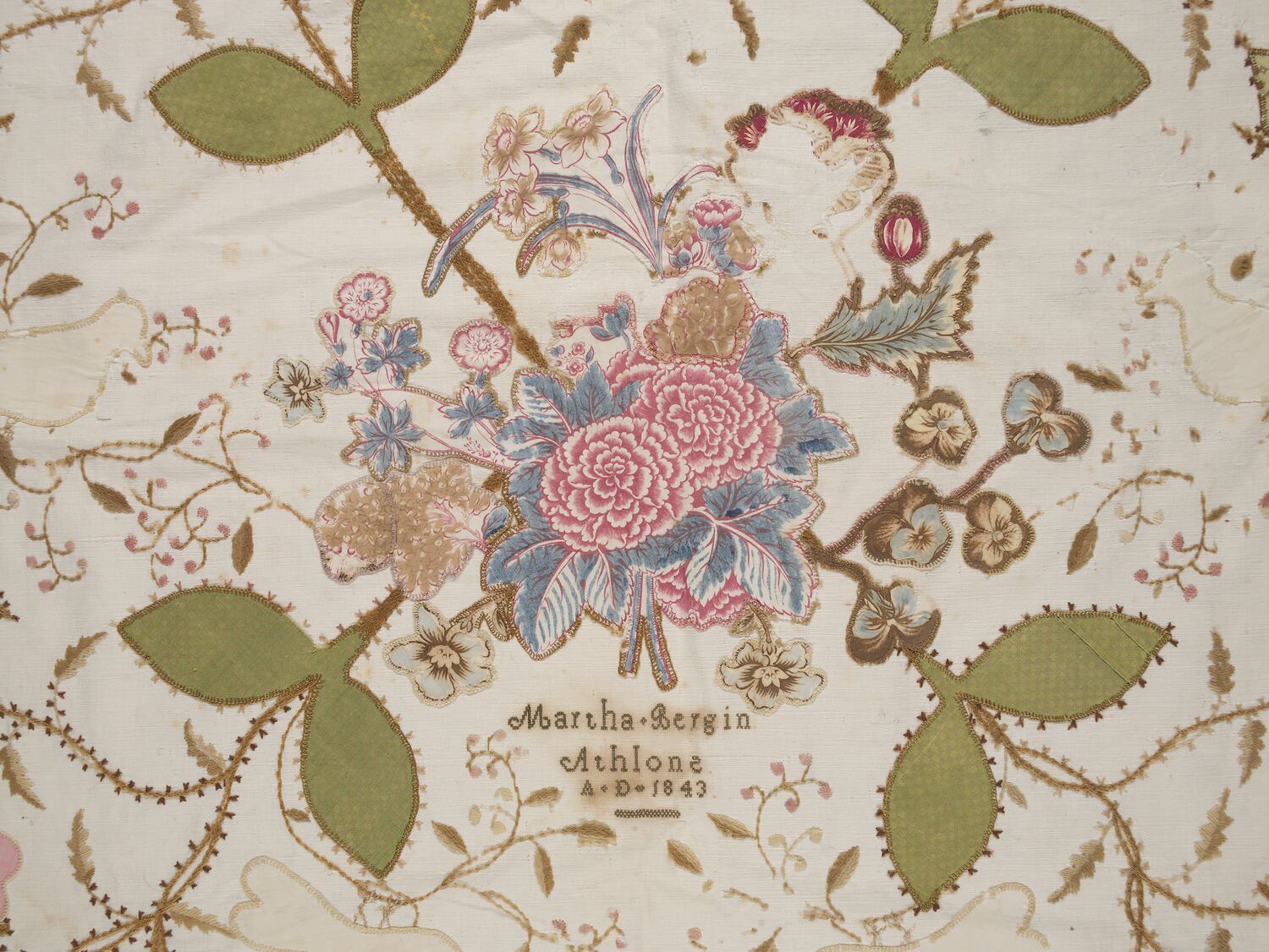 Museums Victoria holds a rare example of textile-based material culture from the goldfields period of Victoria's history. It was made by Martha Bergin, born in 1822 at Rathdowney, Queens County (now County Laois), Ireland. Her father was a draper, which may explain the rich range of textiles which have been incorporated in the quilt and its strong base fabric. (The family drapery business continued for about 100 years after Martha's birth.) Martha appears to have been well-educated, since she wrote letters to her son each week later in life. About the age of 21, in 1843, she made the quilt, possibly for her dowry. Three years later, in May 1846, she married Andrew Tipping. Andrew had been born in 1824 in Castletown, County Westmeath. He was probably involved in land management and farming. Martha and Andrew had a son, after which Martha, her son and her sister travelled to New York in 1848, at the height of the Irish famine. She may have been visiting American relatives. There is no record to suggest that Andrew accompanied her. The immigration records describe Martha as a labourer.