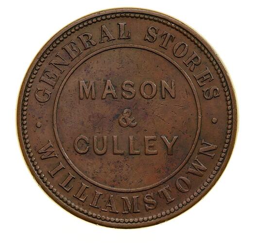 There is no record for a business under this name, located Williamstown, in Victorian Directories between 1851 and 1870. There are, however, separate listings for a Thomas Mason and a Benjamin Culley in that suburb. Thomas Mason appears first as a 'Waterman' in an 1851 directory, but it is not until 1857 that both men are listed. In that year Mason was listed as a general dealer, and Culley as a clothier and draper, both in Nelson's Parade, Williamstown. Both men continued their businesses in Williamstown into the 1860s. John Hope's research presents a more extensive review of the directories, and a number of anecdotal stories about the tokens: