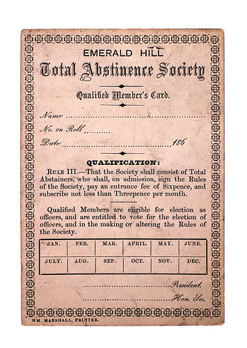 The Melbourne Total Abstinence Society was one of several organisations in nineteenth century Victoria established to promote temperance, oppose the extension of hotel licences, and educate children and adults about the dangers of alcohol. Others were the Order of the Sons of Temperance, the International Order of Good Templars, and the Band of Hope.