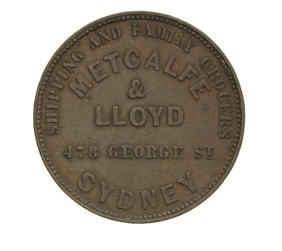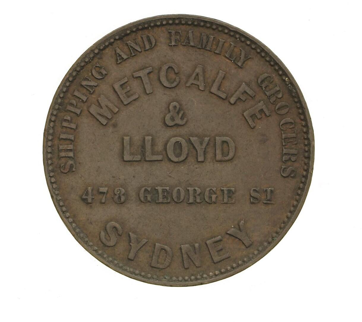J.G. Hanks joined A. Lloyd to establish 'Hanks and Lloyd, grocers' at 319 George Street in 1855. 'The first Hanks and Lloyd tokens must have been delivered that year. The partners took the opportunity to gain publicity by using their first tokens as commemoratives for the opening of the first Sydney Railway, also that year.' Hanks and Lloyd were expecting another shipment of tokens in 1857, but the ship that was carrying them, the Dunbar, was wrecked at the Gap, in the Sydney Heads. Samuel Peek, another token issuer, and his wife Caroline were on board the Dunbar and drowned when it sank. Although replacement tokens were ordered, they did not arrive until 1858.