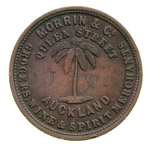The Auckland Company, Morrin and Co., issued three different varieties of trade tokens. The company's period of activity is not known, but as Auckland Numismatist H.A. Robinson said, 'Apparently John Morrin did not remain in business very long as in later life he was the Auckland representative of Arthur Heather, merchant, Customs Street.' (Robinson, 1974)