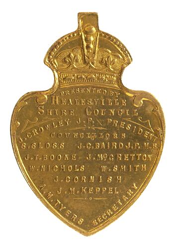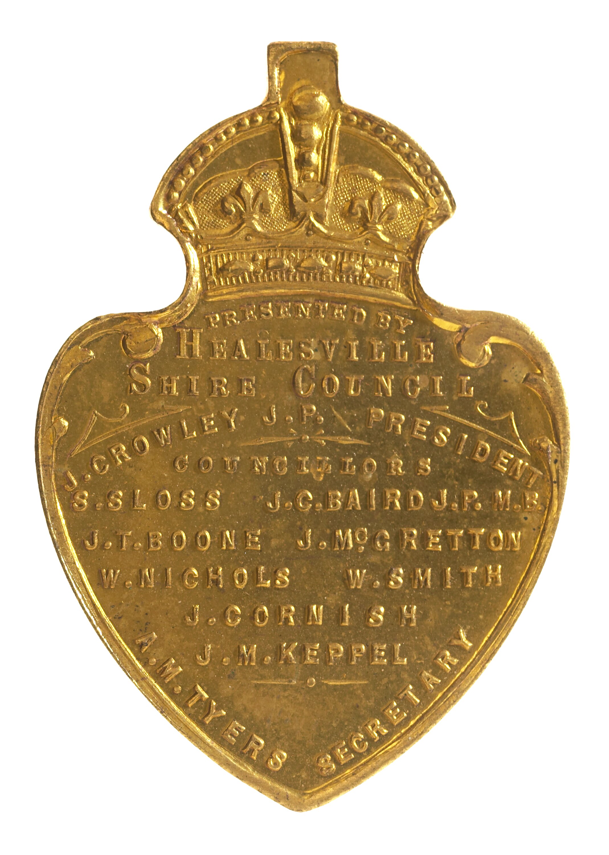 J. Crowley was named as President of the Healesville Shire Council on a medal issued in 1902 to commemorate the coronation of Edward VII (NU 20247). Crowley Road, Healesville, may be named in his honour.