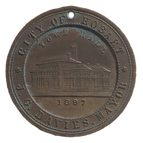 In 1881 Hobart Town was re-named Hobart. In 1895 the town gave its name to the Hobart Conference, which adopted the proposal to revive Federation. Nevertheless, Hobart remained staunchly supportive of the Crown, and in 1897 it issued a medal for 1897 Diamond Jubilee of Queen Victoria (NU 34783).