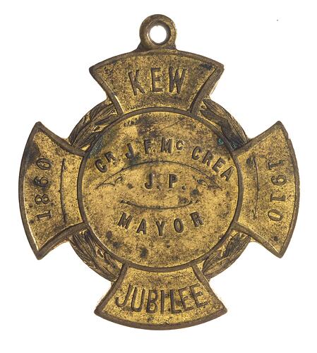Kew held its Jubilee in 1910, and issued a medal to commemorate the event (NU 33021). Between 1910 and the outbreak of the second world war Kew's population approximately tripled. Kew was proclaimed a town on 8 December, 1910, and a city on 10 March, 1921. Post-war housing growth occurred in outlying areas near Yarra Bend Park and around Stradbroke Park to the north-east.