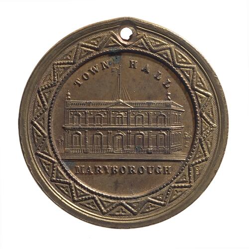Maryborough became a Borough in 1857. Its infrasctructure continued to develop, and the railway arrived in 1874. Maryborough became a Municipality in 1875. It opened a new town hall in 1887, the year it issued a medal to commemorate the jubilee of Queen Victoria (NU 20418).