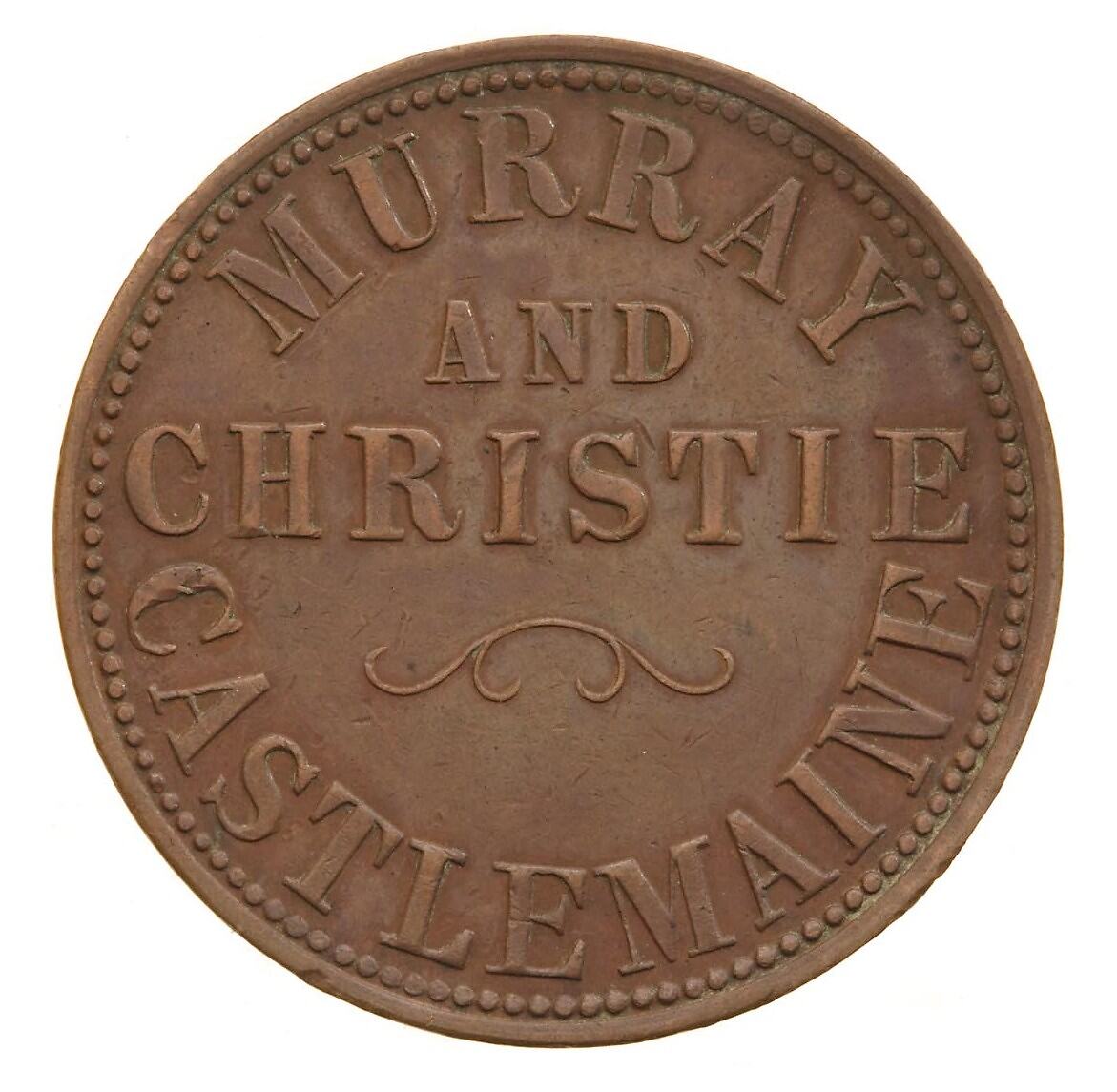 John Christie was also a Scot, coming from Oldcroft, Stirlingshire. He came out to Victoria in the Aberfoyle in 1852, the same ship that brought out Duncan Gillies, later Premier of Victoria (1886 to1893). John Hope states that he married the daughter of fellow token issuer and Market Square businessman William Froomes. Like Murray, Christie also retired to Sydney. He was alive when Gardner wrote his biography in 1910/1911.