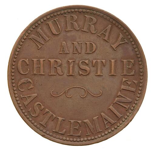Castlemaine grocers David Murray and John Christie operated their store from between the shops of George Ryland & Co., and W. Froomes, both of whom also issued tokens, as did their near neighbour, T. Butterworth & Co., also of Market Square.