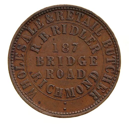 Robert Broom Ridler was an Englishman, born in Devonshire in 1825. He arrived in Victoria in about 1852: 'A few days after landing he took a position as salesman with Mr. Butler in the shop which shortly afterwards became his own, at 67 Bridge Road, Richmond, near the corner of Union Street. Mr Butler sold the business to two partners, his brother Alexander and Ridler.' By 1856 Ridler was running the shop in his own name. John Hope notes that Butler was later treasurer of the Richmond Council. In 1857 Ridler married Sophia Wild, later having eleven children. According to Gardner, after 'many years' he built a shop at 185-187 Bridge Road. He sold his business to a Mr Brockman in 1877 and retired to a property near Dandenong, where he died in 1898. (Gardner)