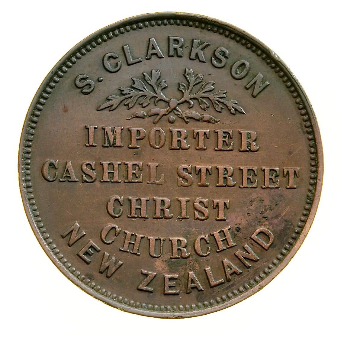Born 11 July 1836 in the parish of Greenwich, Kent, Samuel Clarkson was 14 years old when he arrived in Lyttelton, New Zealand, probably in late 1850, having left Plymouth, England, on board the Castle Eden on 8 October 1850. He had travelled with his father and in April 1851 they were joined by his mother and siblings. Some time after the family was reunited they decided to move to Christchurch and carried all their belongings across the mountains. Samuel's brother David and his wife Elizabeth were involved in two token issuing drapery businesses (the Christchurch drapery store they founded, 'Dunstable House', was sold to William Pratt, who issued tokens; their own second business, Clarkson & Turnbull of Timaru also issued tokens).