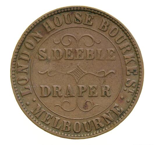 Deeble issued four penny tokens, all in 1862, with a range of Stokes' stock reverses, bearing the address 'London House, Bourke Street'.