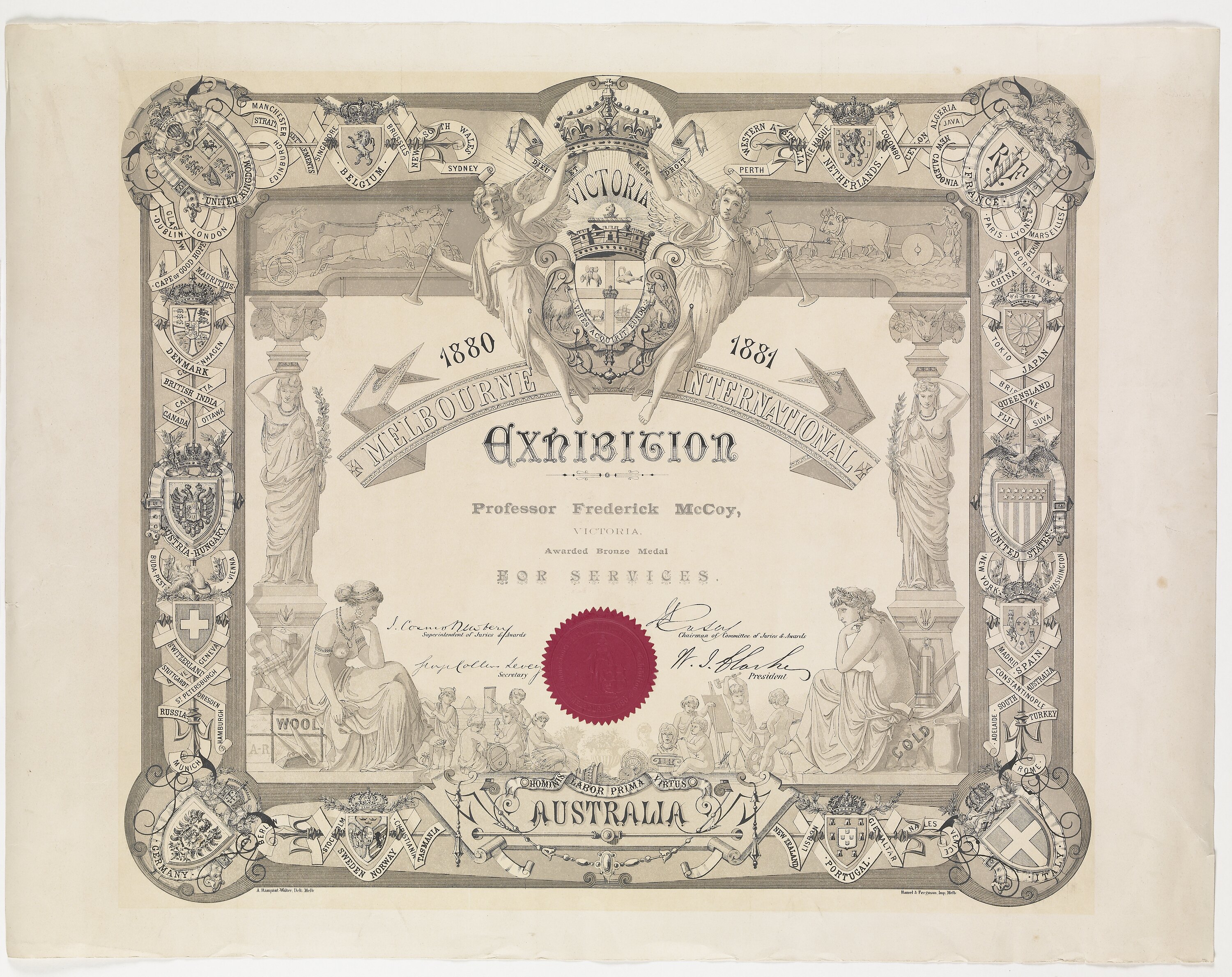 McCoy served as a member of the Council of the University 1882-87 and a member of the Royal Society of Victoria Council, and later as Vice-president and President. He was a Commissioner for the Victorian, Intercolonial and International Exhibitions, and was awarded medal NU 23852 for his services at the Melbourne International Exhibition (Official Record, p. xviii). He also sat on Jury 1 for that exhibition, assessing artworks including oil paintings, drawings, lithographs and modelling (Official Record, p.21). McCoy strongly supported the causes of education and research. He received many European and Australian honours for his work.