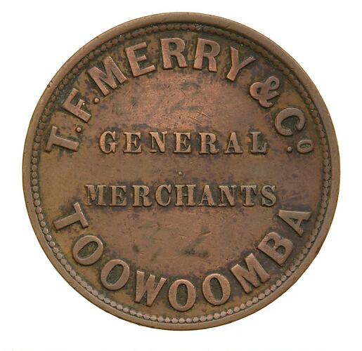 Some time later he moved to Toowoomba and established himself as a general merchant in Ruthven Street. He opened branches of his business in Warwick, Stanthorpe, Goondawindi and other Queensland locations. He was one of the first directors of the co-operative store J.P. Barnes & Co., which still existed as the Barnes Co-op in 1970. Further research in Toowoomba would no doubt reveal when Merry's store was opened, but at this stage it is unknown. No copper tokens are known to have been issued in Queensland after 1865, so it is likely that Merry had opened his Toowoomba store by that date.