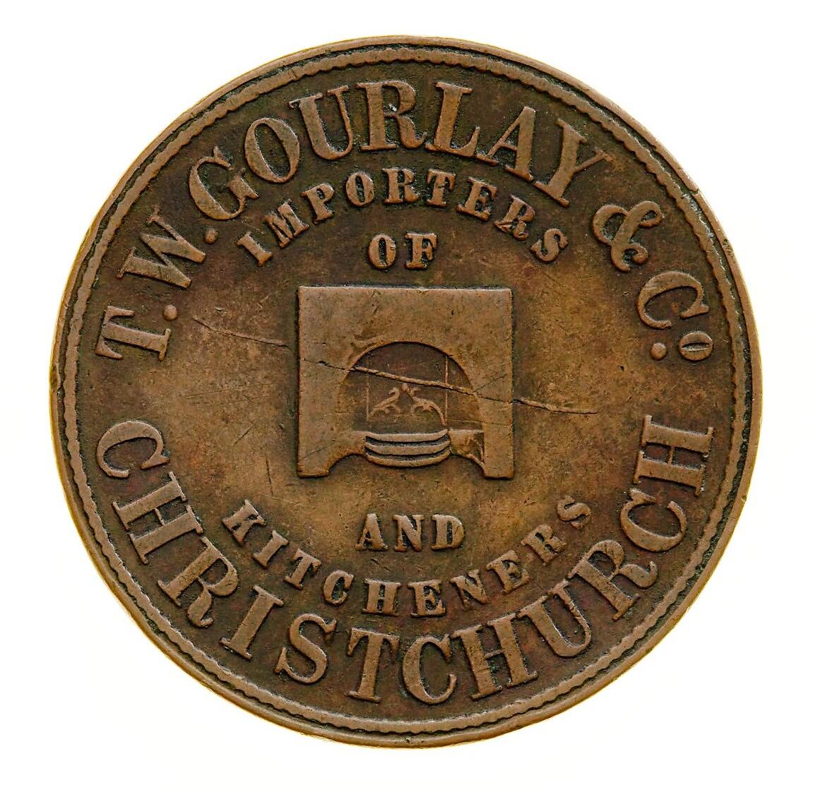 This firm traded briefly in Christchurch, probably from 1862 to 1865. The earliest record that Christchurch numismatists found while researching the company was from the 22 October 1862 edition of the local paper the Christchurch Press. It announced that the store would be opening on 15th of September; presumably this advertisement had been running for more than a month by the time the October edition seen by the researchers was printed. The advertisement said that Gourlay & Co. would be selling 'an assortment of General Ironmongery, comprising builders ironmongery, brassfoundry, carpenter's tools and a great variety of articles too numerous to mention in detail.' The store was known as Economy House, a popular mid-nineteenth century name for shops. The store was located in Ferry Road, Christchurch.