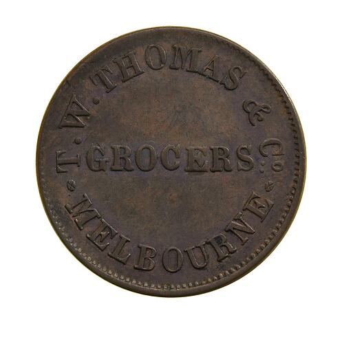 T.W. Thomas and Co. opened a grocer's business during 1854 in one of the premises previously occupied by James Nokes, 55 Bourke Street Melbourne. They soon also occupied No. 53 1/2 Bourke Street. The fact that Thomas used Nokes' reverse, commemmorating the arrival of Lieut. Governor Hotham in mid-1854 adds strength to the timing of the sale of the business. Gardner notes that Thomas was thought to be an assumed name and that his real name was thought to be Walters.