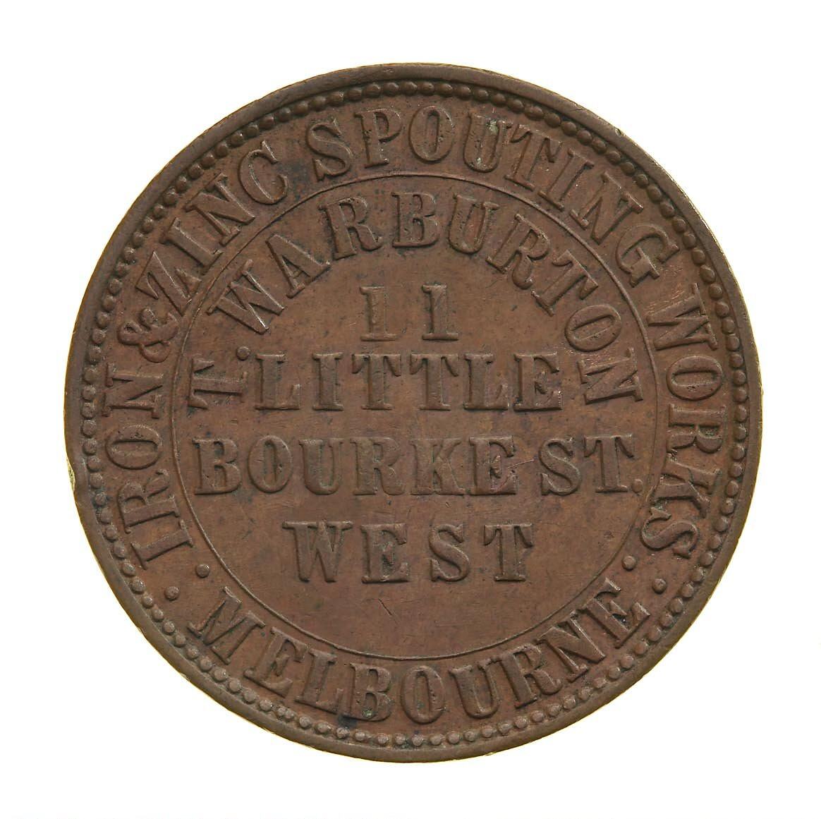 The seven tokens struck for Thomas Warburton were all issued in 1862, bearing on the obverse his address, 11 Little Bourke Street, and the name of the business. The reverse was a stock reverse made by Thomas Stokes, featuring the Australian arms and the motto 'Advance Victoria/1862.'