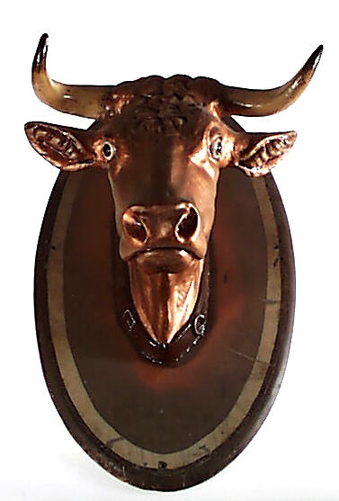 This bustling centre of Melbourne's early social scene was captured in a range of sketches of the city, including one by the famous artist Thomas Gill (1854), and another by Samuel Calvert in 1865, which clearly shows the exterior of the hotel. Whereas the plaster Bull's head that Museum Victoria received from Whelan the Wrecker was clearly made to be displayed indoors, the hotel had a very literal 'bull and mouth' sign outdoors, of a bull above a grinning mouth.