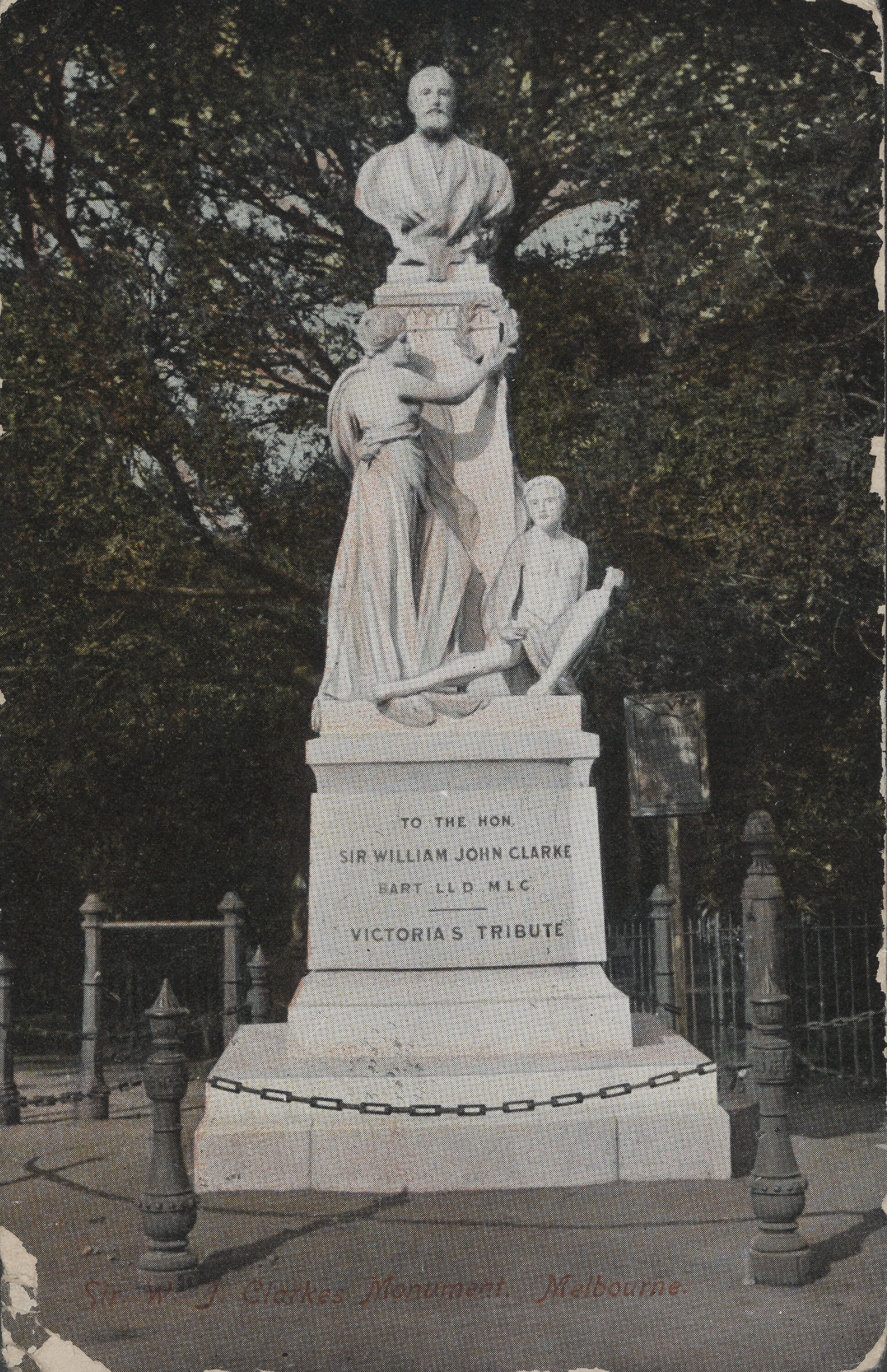 Sir William John Clarke, Bart., M.L.C., L.L.D., J.P., was the eldest son of the late Hon.W.J.T. Clarke, M.L.C.. He was born in 1831 in Tasmania and arrived in Victoria in 1850. He studied sheep farming on his father's Dowling Forest station for about two years, and then focussed on the management of the Woodlands station, in the Wimmera. He then returned to Tasmania, where he lived for the next ten years, working the Norton-Mandeville Estate in conjunction with his brother, Joseph. In 1862 he became manager of his father's concerns in Victoria, and on the latter's death in 1874 succeeded to his Victorian estates. Sir William was particularly interested in farming as a science, and supported scientific instructor R.W.E. M'Ivor, who lectured on agricultural chemistry. He also founded the Rupertswood Battery of Horse Artillery, Victoria. He was a generous philanthropist.
