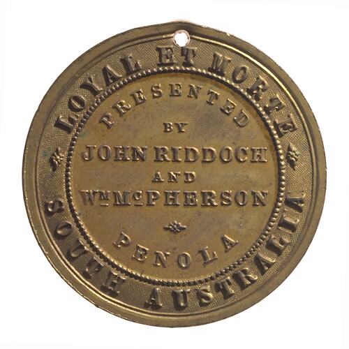 In 1887 McPherson and fellow agriculturalist John Riddoch were named on a medal issued to commemorate Queen Victoria's jubilee. The medal is inscribed Penola, South Australia. These medals were distributed to every child in the district as part of the Penola celebrations for the Queen's Jubilee, which were held on Monday 20th June 1887 (Jubilee Celebrations, 1887).