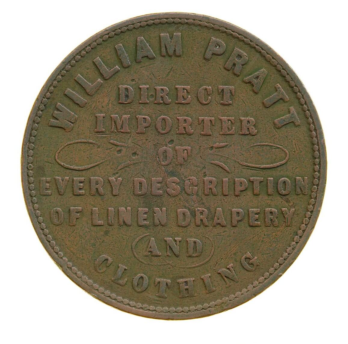 The history of the store does not include any further details about Pratt, other than to say that his estate retained ownership of the land mentioned above until the 1940s. Ballantyne's large and prestigious store was still in business in 1950. This source states that the most likely period for the issue of the tokens was between 1864 and 1872. The tokens were struck by W.J. Taylor of London.
