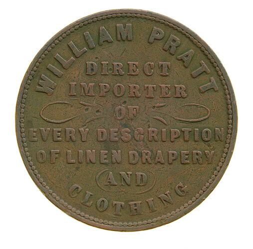William Pratt was born in 1823 and after his education was apprenticed to the drapery trade. After working in London he migrated to New Zealand and arrived as one of the early settlers of Nelson on 4 February, 1843. After pursuing a range of occupations, including growing potatoes in Tahiti, farming in New Zealand and ship building, he was working as a book keeper in Wellington by 1848. The following year he moved to Lyttleton, Christchurch's port town. He had a prefabricated store made and shipped to him. The first public record that Canterbury numismatists could find of his business was an 1851 advertisement from the Lyttleton Times of 11 January 1851, in which his business was described as a 'general drapery store and bakehouse', located in Canterbury Street.
