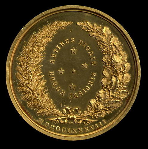 The Royal Mint was asked to strike the medal, but Deputy Master George Anderson reported that some of the relief was almost undercut, requiring unusual pressure, and was not feasible. This had happened to Altmann before, when his winning design for the 1880 exhibition medal was also rejected. Altmann was too unwell to re-work his design, so George Anderson was asked to both design and execute the medal. The dies were to be engraved by Stokes & Martin. Anderson set to work, and produced a medal that featured Queen Victoria's head on the obverse, based on the Jubilee medal by Sir Joseph Edgar Boehm, except that the crown had been replaced by a 'more firmly seated one which is seen in the New Zealand war medal'. On the reverse he provided a wreath composed of the leaves and acorns of British oak and the leaves and acorns of the wattle. The oak and wattle were tied together 'by a true-lover's knot, 'symbolizing the unity and affection between the mother country and the colony'. The motto 'Artibus dignis, honor insignis' - meaning 'to the deserving arts, distinguished honour' - was placed within the wreath, encircling the Southern Cross.