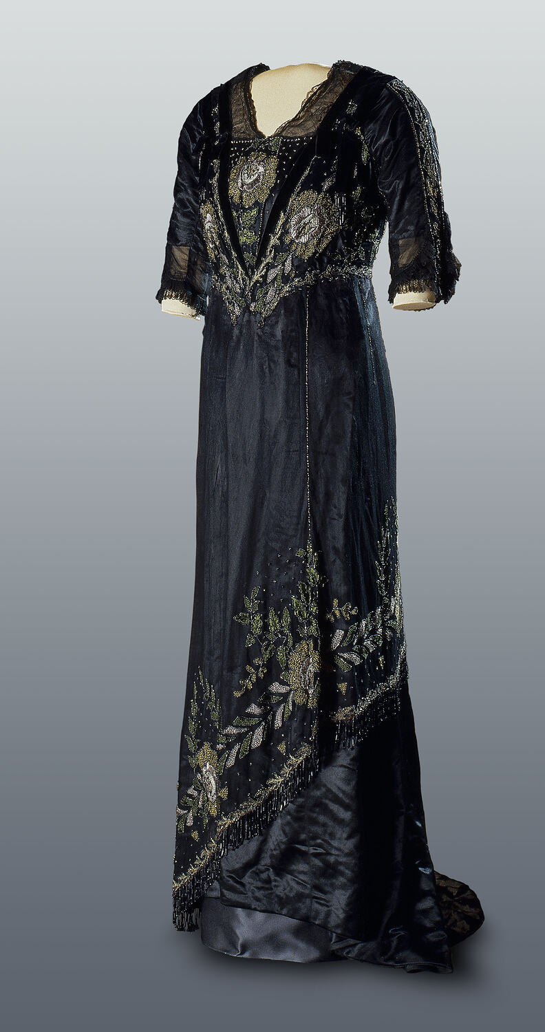 Black dress worn by Mrs Sabina Peipers to the opening of Federal Parliament, held at the Royal Exhibition Building on Thursday 9 May 1901. It features in Museums Victoria's Melbourne Story exhibition.