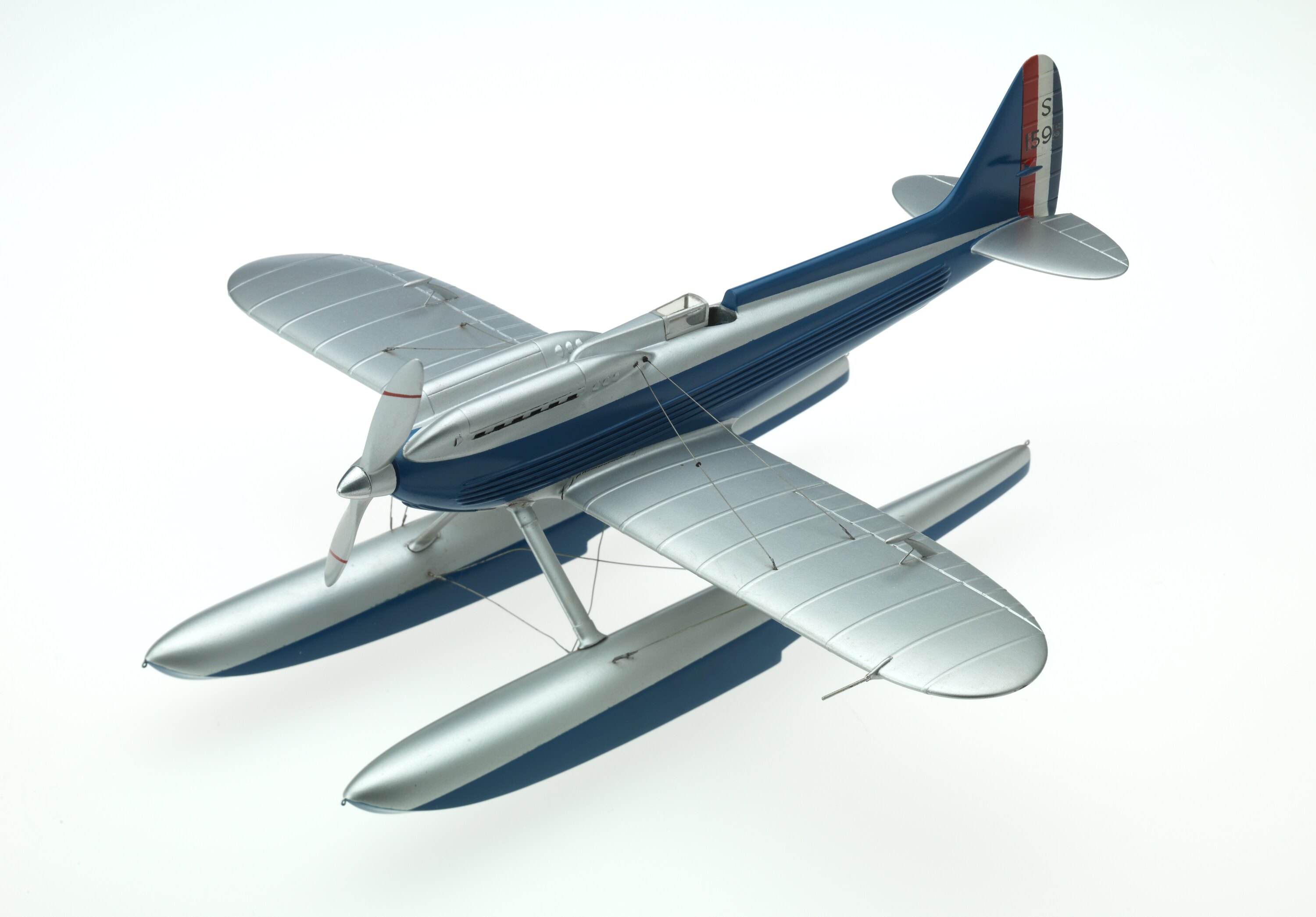The S.6B was designed by Reginald Mitchell of Supermarine Aviation Works Ltd as a developed version of his previous S.4, S.5 and S.6 seaplanes. The S.6B retained the Rolls-Royce R engine fitted to the 1929 S6 which was capable of delivering about 1,500 horsepower for short periods. Sir Henry Royce developed the R engine for the 1931 contest to give 2,783 horsepower, a 21% improvement. The 1931 Schneider Trophy contest was something of an anti-climax after the French and Italian teams withdrew their entries. Flight Lieutenant John Boothman, RAF, flew the Calshot course alone, achieving an average speed of 340.08 miles per hour over seven laps to keep the Schneider Trophy in Britain and set a world record speed of 379.05 miles per hour the same day. This machine later set an absolute world air speed record of 407.50 miles per hour. Mitchell went on to design the Spitfire fighter aircraft which first flew in 1936. The Rolls-Royce R was developed into the Griffon engine which was used on later model Spitfire aircraft as well as other aircraft types. The S.6B was later donated to the Science Museum in London where it remains on display.