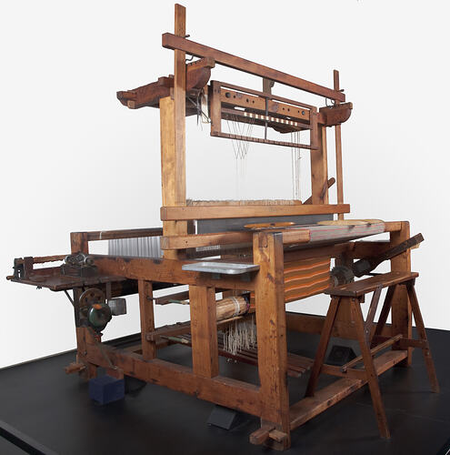 In 1950 Anna and Ervins migrated to Australia, with their son Erik and Anna's father, Ernest, bringing the loom with them. Anna found it difficult to find suitable weaving materials in post-war Australia, so Ervins designed and built an unplying machine, using cans, scrap metal and wood. He then used the machine to unply balls of wool to make weaving threads for Anna. This machine is also part of the Museum's collection. Anna became one of the few suppliers of fabric for Latvian national costumes in Australia in the 1950s and 1960s, and exhibited her weaving nationally, at exhibitions and Latvian cultural festivals. Museum Victoria's collection contains several examples of this traditional weaving created by Anna, which highlight the importance of cultural maintenance by the Latvian community in Australia during this period.
