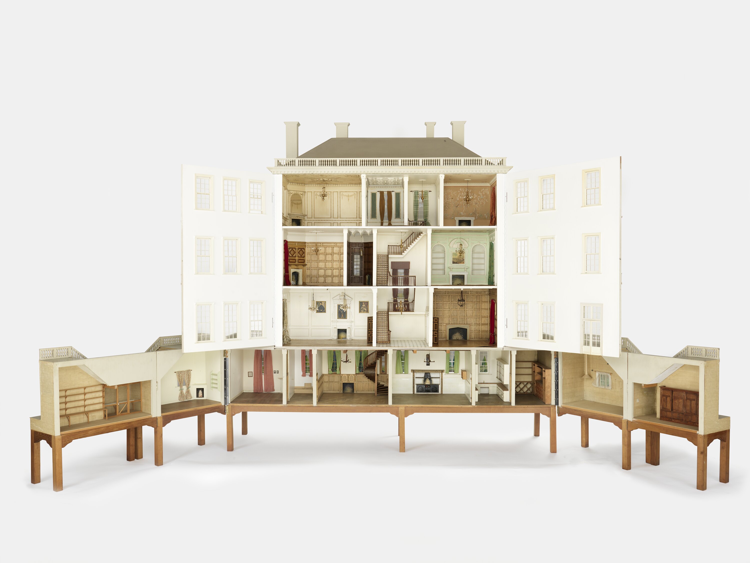 Although some items were purchased during shopping trips to Melbourne, the majority of furnishings were constructed by Felicity's own hands, using numerous reference books and magazines, such as 'Country Life' (the doll's house itself actually appeared in the magazine in 1980). She carved, veneered and glued the furniture, often using her husband's scalpels to achieve a high level of detailing, as well as sewing, weaving, constructing and painting all the other bits and pieces found in the house; she also decorated the walls, ceilings staircases and floors of the house itself. In addition to the grander family rooms, her attention to detail can be seen in the 'below stairs' areas of the house, such as the kitchen, laundry and staff quarters.