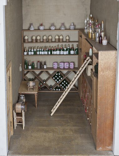The cellar is one of 21 rooms in the dolls' house Pendle Hall. It was designed and decorated by Felicity Clemons over a forty year period, and each piece of furniture and fixture was handmade by her. She used books and magazines for inspiration, and to achieve a high level of accuracy in the design and execution of each item.
