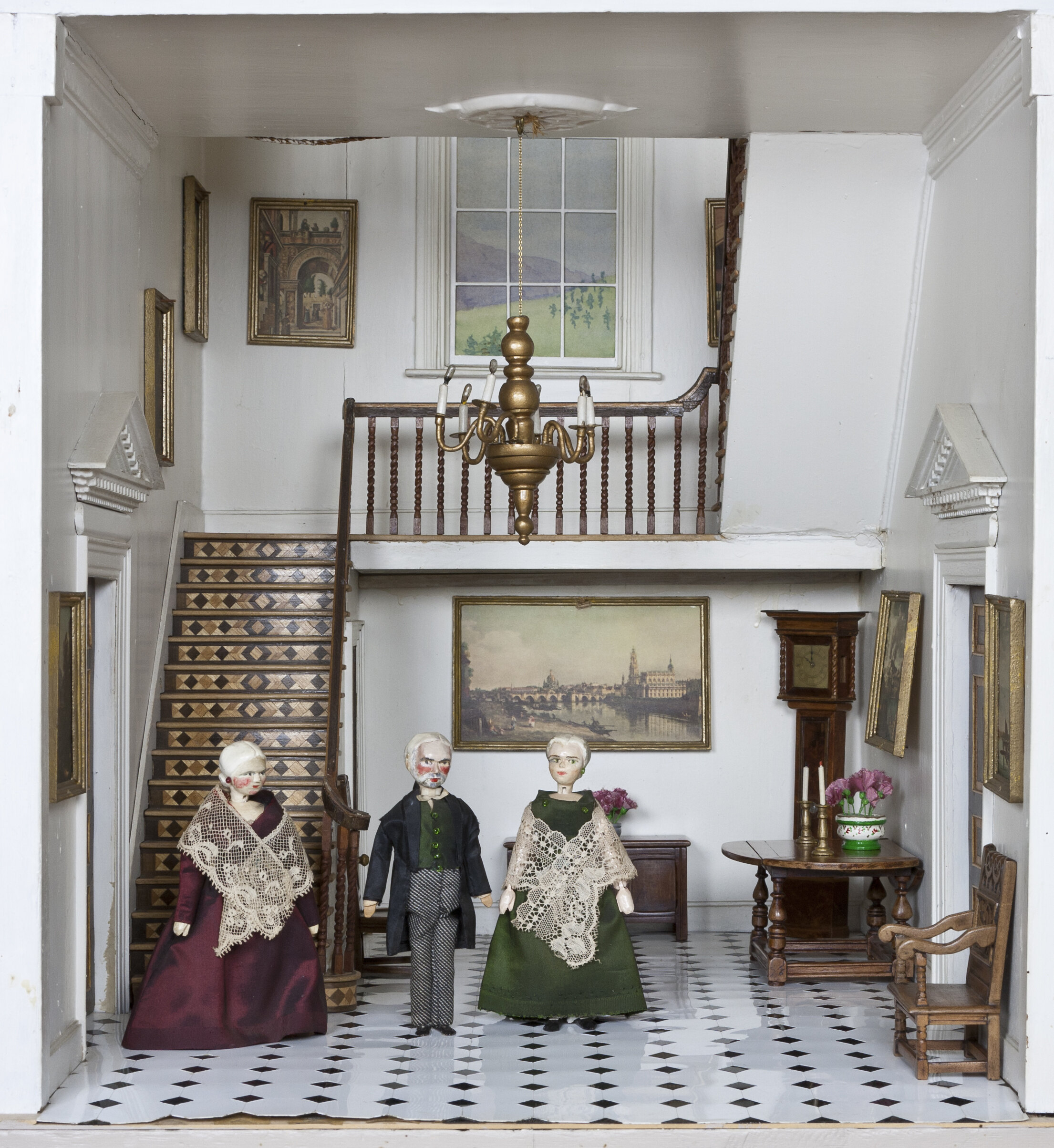 The entrance hall is one of 21 rooms in the dolls' house Pendle Hall. It was designed and decorated by Felicity Clemons over a forty year period, and each piece of furniture and fixture was handmade by her. She used books and magazines for inspiration, and to achieve a high level of accuracy in the design and execution of each item.