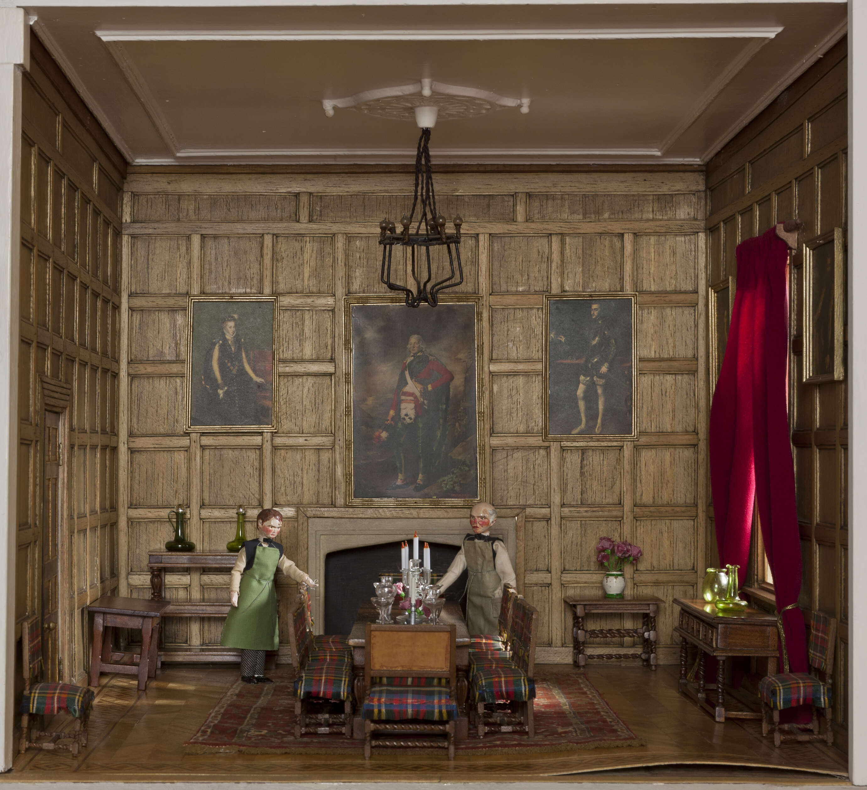 The dining room is one of 21 rooms in the dolls' house Pendle Hall. It was designed and decorated by Felicity Clemons over a forty year period, and each piece of furniture and fixture was handmade by her. She used books and magazines for inspiration, and to achieve a high level of accuracy in the design and execution of each item.