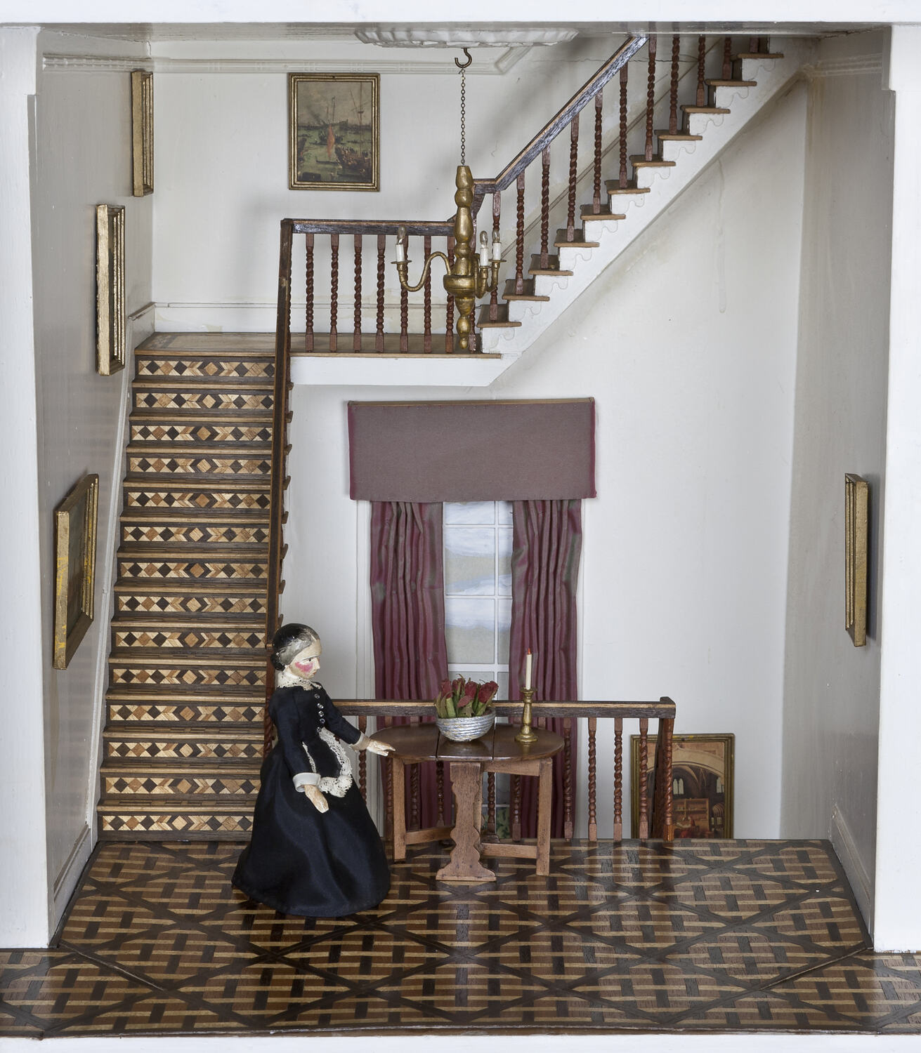 The first (floor) landing is one of 21 rooms in the dolls' house Pendle Hall. It was designed and decorated by Felicity Clemons over a forty year period, and each piece of furniture and fixture was handmade by her. She used books and magazines for inspiration, and to achieve a high level of accuracy in the design and execution of each item.