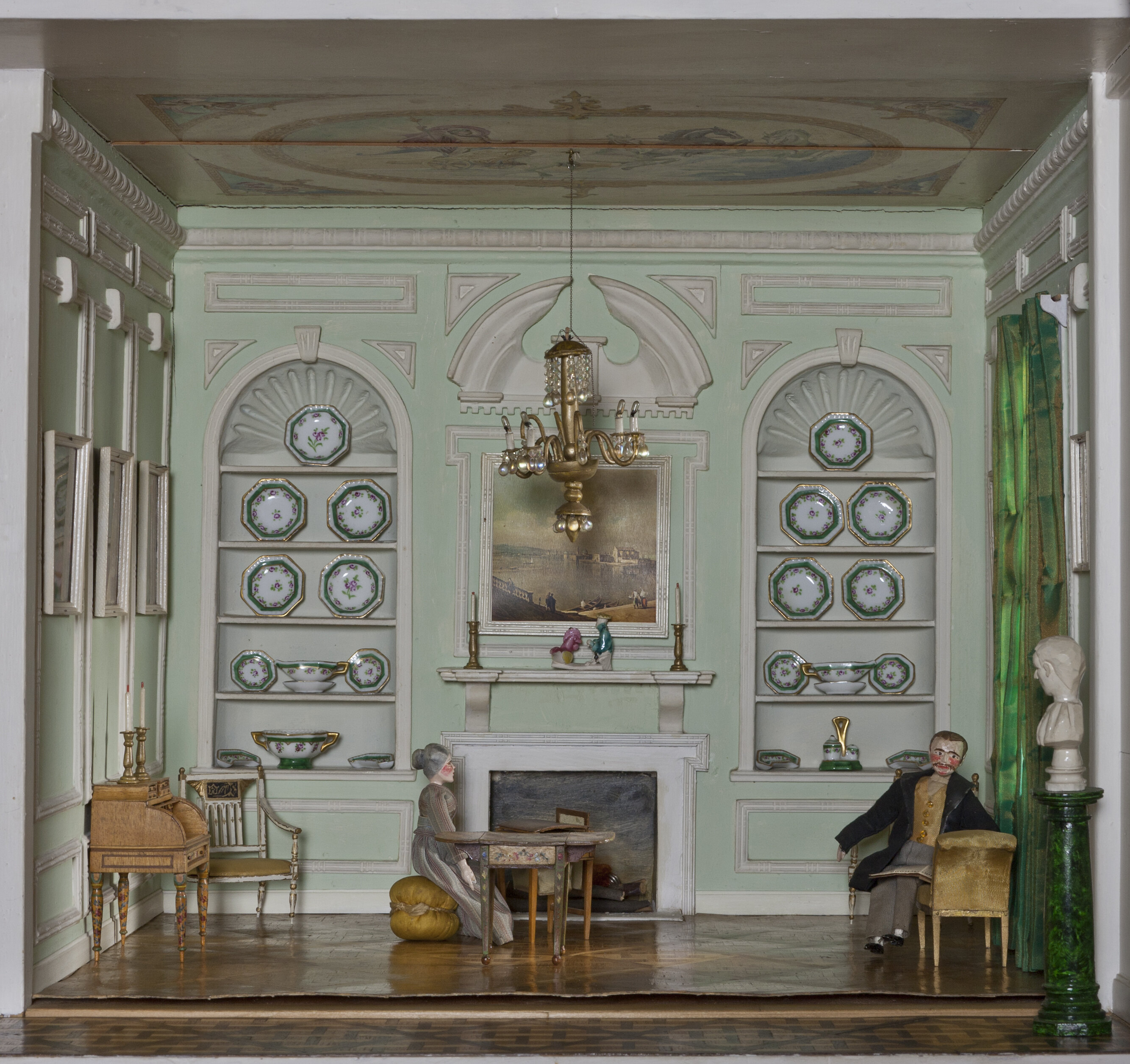 The walls are decorated with moulded plaster decorations. A four branched candelabra hangs from the ceiling. The floor is covered with intricately decorated parquetry. Along the front is a strip of multicoloured parquetry, signifying a separate hallway, on which sit a green and black painted stand holding a white male bust (a matching piece to the one outside the library.)