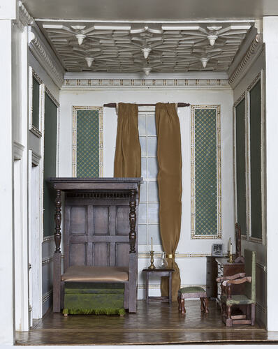 The Oak Bedroom is one of 21 rooms in the dolls' house Pendle Hall. It was designed and decorated by Felicity Clemons over a forty year period, and each piece of furniture and fixture was handmade by her. She used books and magazines for inspiration, and to achieve a high level of accuracy in the design and execution of each item.