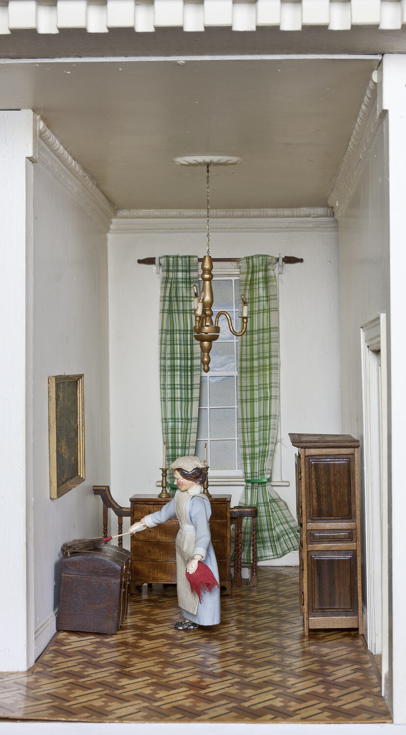 The top landing is one of 21 rooms in the dolls' house Pendle Hall. It was designed and decorated by Felicity Clemons over a forty year period, and each piece of furniture and fixture was handmade by her. She used books and magazines for inspiration, and to achieve a high level of accuracy in the design and execution of each item.
