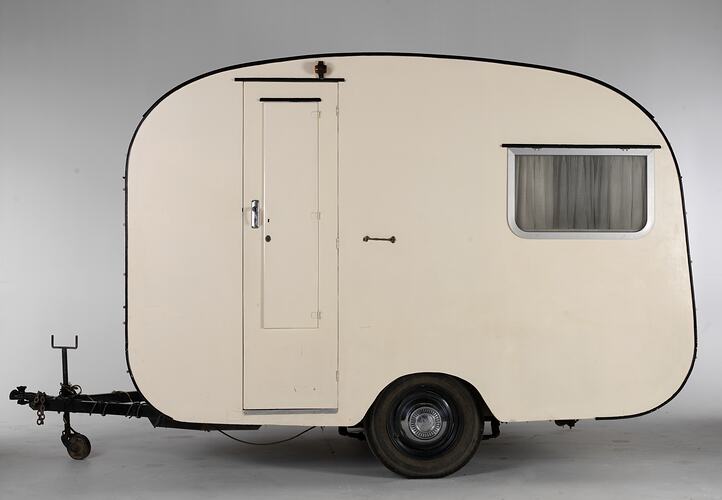 Richard and Jean Hayes purchased their caravan on 5th August 1957 from 'Skyline Caravans' for 183 pounds. It is a 10 foot long and 6 foot six inch wide plywood caravan with one double and one single bed. An annex provides a second room, which was necessary to accommodate the family's two adults and four children (Barbara, Graeme, Ian and Linda). Initial holidays were to the Rosebud foreshore, although later they travelled to Lakes Entrance, Wilson's Promontory, Bright, Shepparton, Mildura, Swan Hill, Mount Gambier, Adelaide, and parts of New South Wales and Queensland.