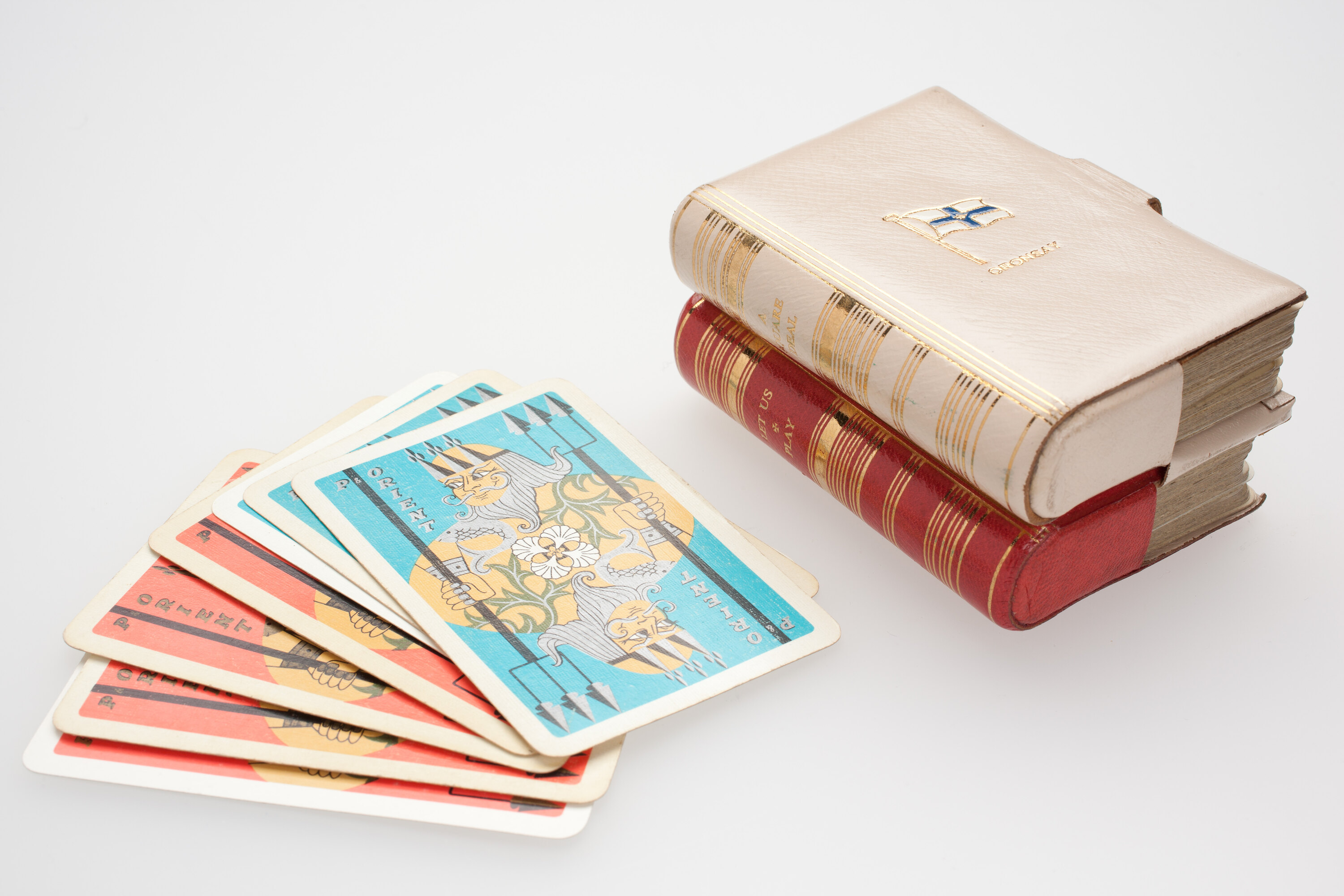 Twin set playing cards contained in vinyl/leather case modelled as 2 adjoining gilt book covers - 1 red, 1 cream. 'Oronsay' and Orient Line flag embossed on front. Case has strap and press stud to seal. 1 pack cards pink, 1 blue, all with same image of Neptune and 'P&O Orient' inscribed on each card.