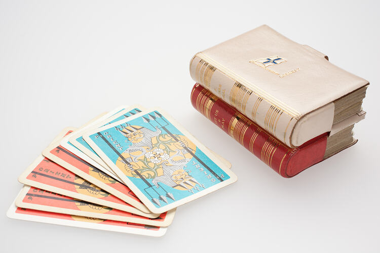 Playing cards produced as souvenirs for the Orient ship line 'Oronsay', circa 1950s. The Oronsay transported migrants to Australia after World War Two. The cards feature the image of Neptune which was a popular symbol of the ocean voyage and appeared commonly on the crossing the equator certificates received my many passengers.