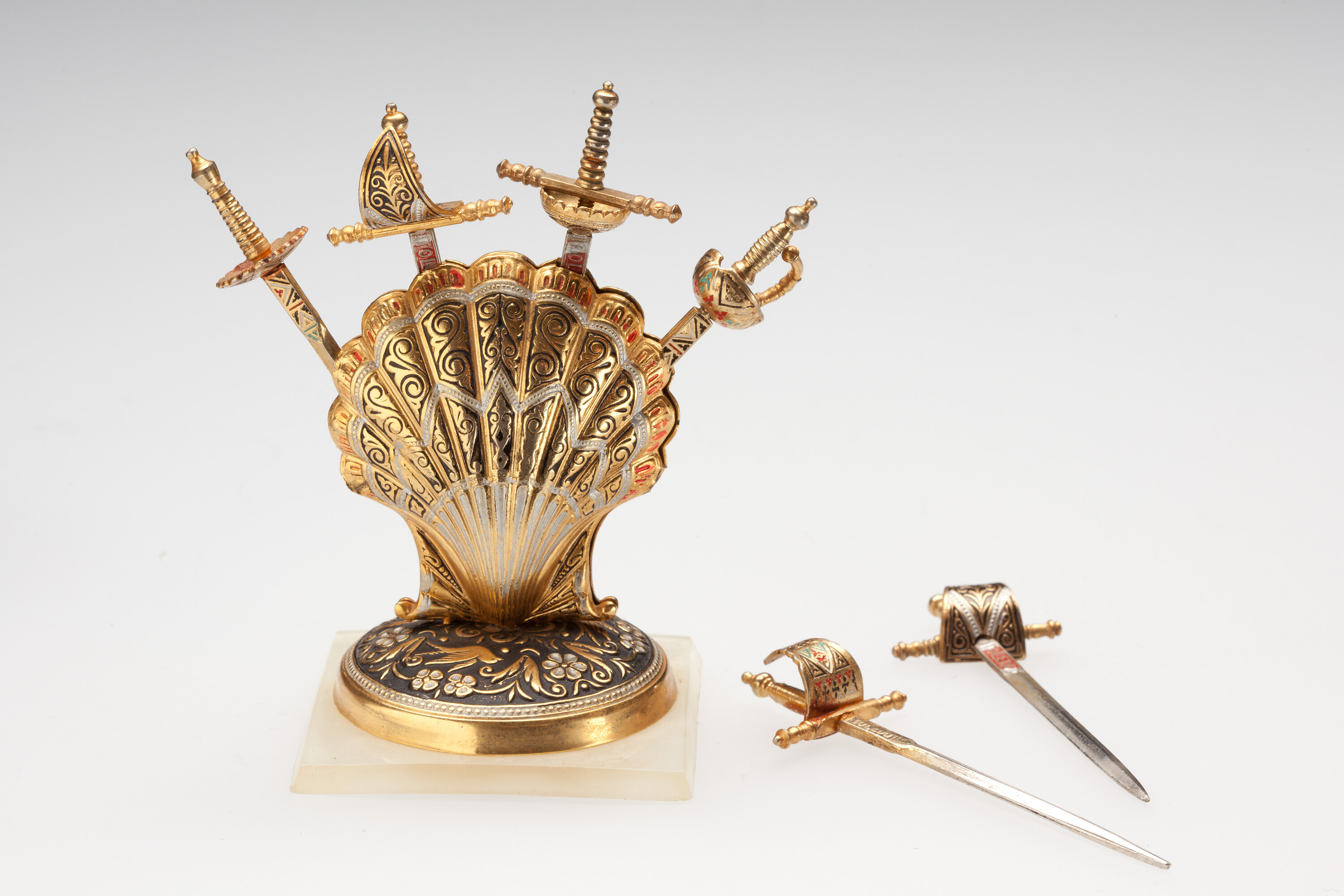 Metal 'clam' shell painted gold with black, red and white decoration on a round base attached to a square plastic stand. Across the top of the shell are six openings into which slot six miniature swords.