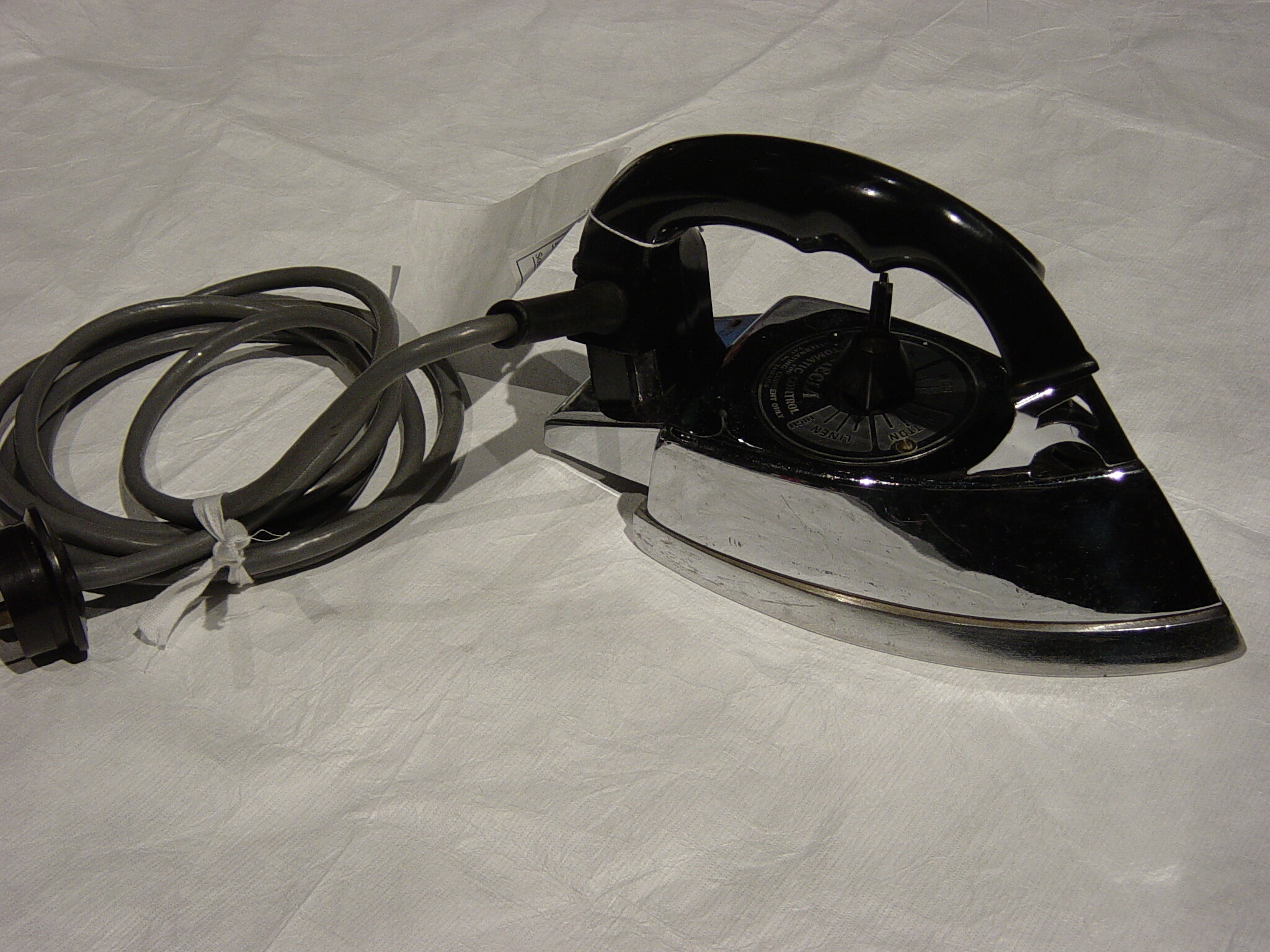 Stainless steel 240 volt AC electric clothes iron with black bakelite handle. This model appears to be of a later design and has adjustable thermostat temperature control with different heat settings based on the type of fabric being ironed. Patent number: 2418/35.