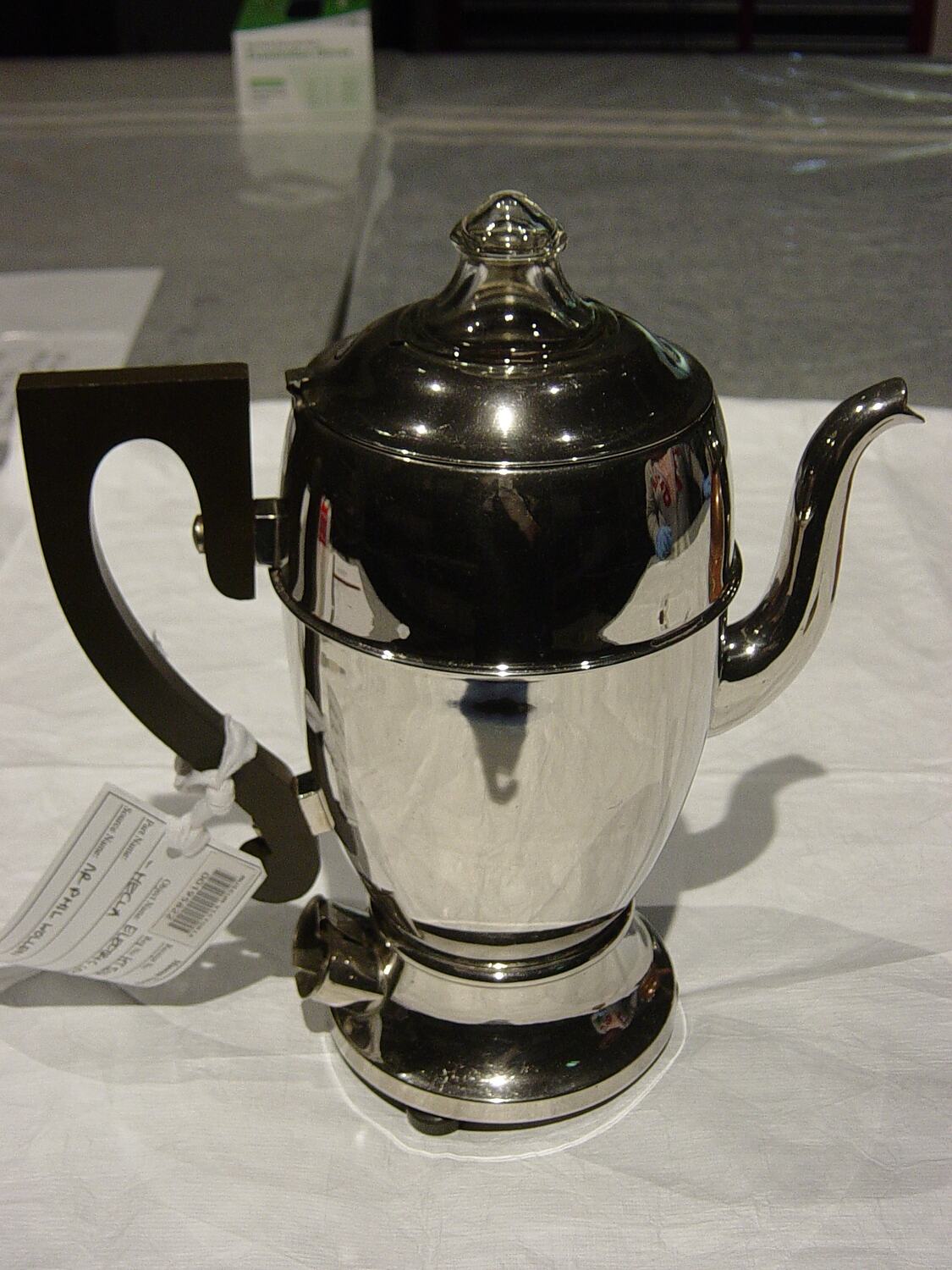 Coffee pot made of stainless steel. Has a black bakelite handle and is designed to accept a standard flat 2-pin 240 Volt AC electric power cord. Has a clear glass dome or inverted cup fitted to the centre of the lid.