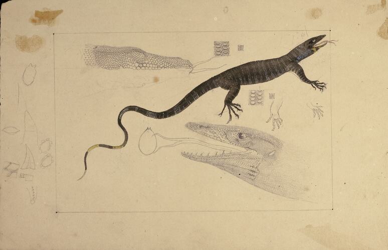 Lace Monitor, Varanus varius (White, ex Shaw) by Frederick Schoenfeld. Unnumbered drawing, 17cm x 27cm. Drawing for Plate 41 in The Prodromus of the Zoology of Victoria by Frederick McCoy.