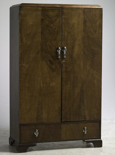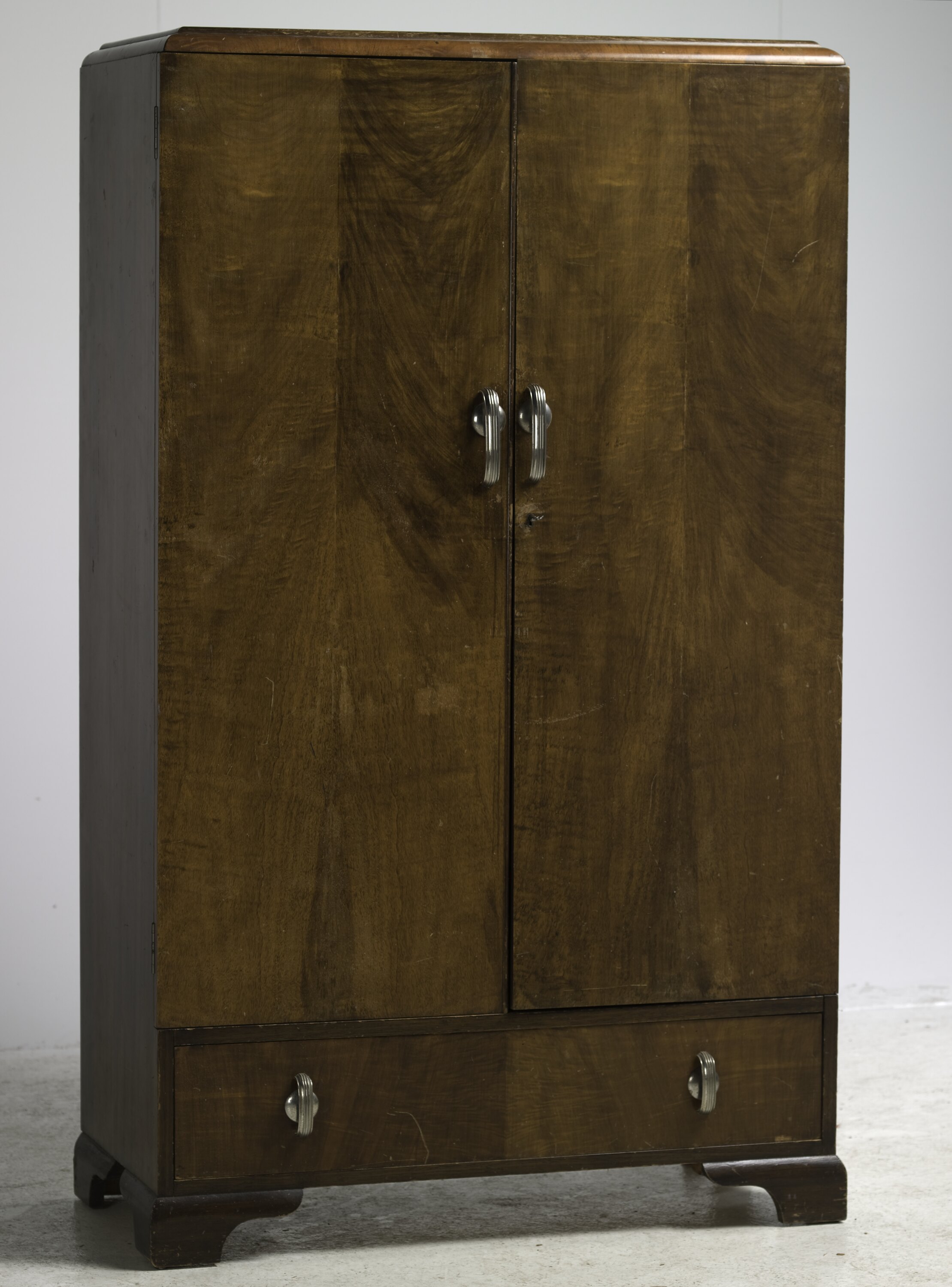 Walnut veneer wardrobe-style glory box. Two doors open onto a series of shelves, shallow trays and a lower drawer for housing accumulated domestic goods for marrriage.