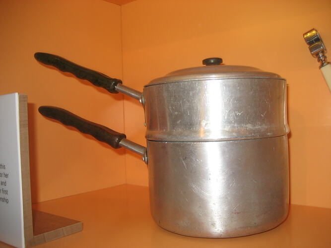 2 part aluminium saucepan with bakerlite handles, one sits on top of the other with lid