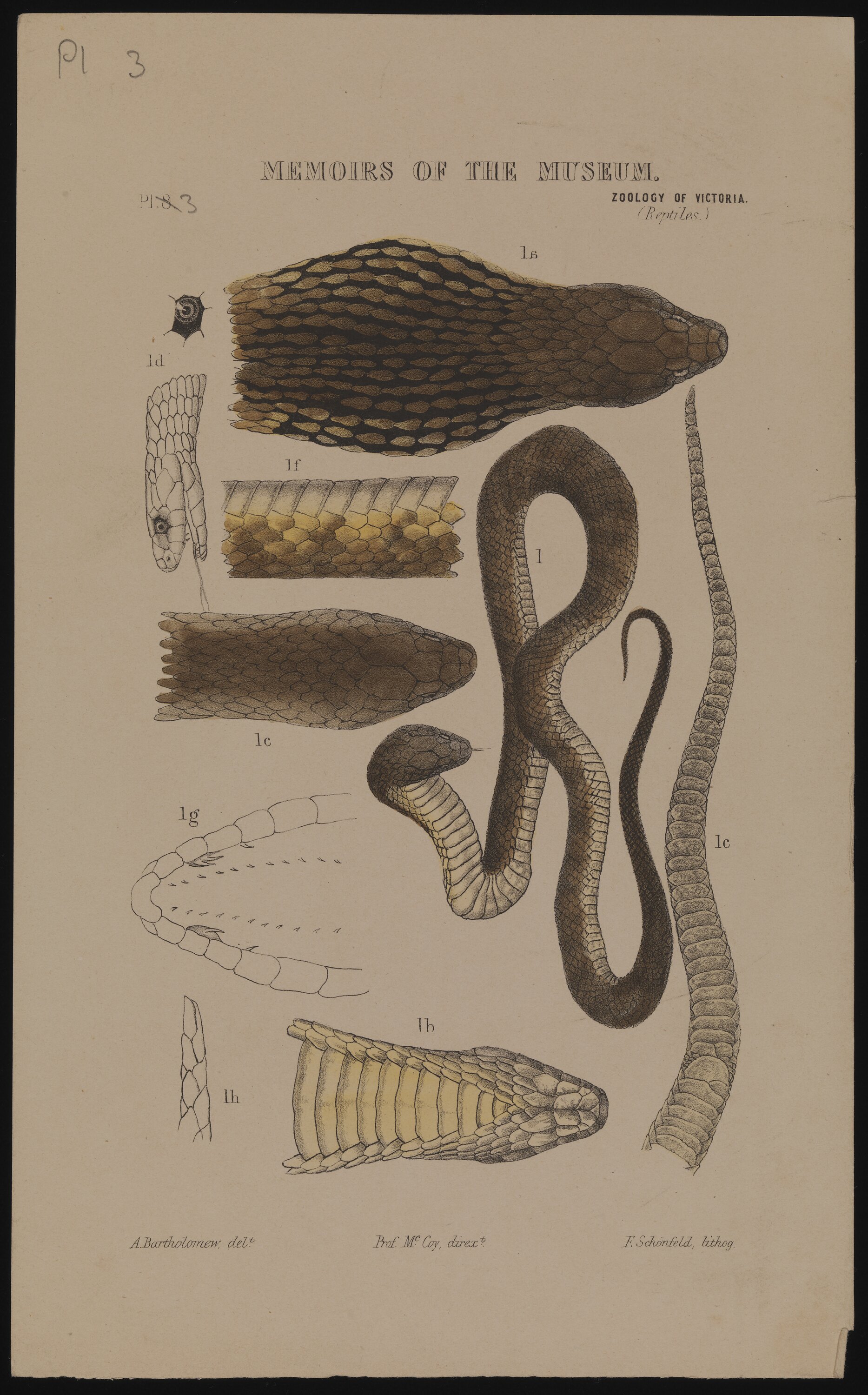 [Pl.3 written in pencil] Pl.3 / MEMOIRS OF THE MUSEUM. / Zoology of Victoria (Reptiles) / A.Bartholomew, del. / Prof McCoy direct. / F.Schonfeld, lithog.
