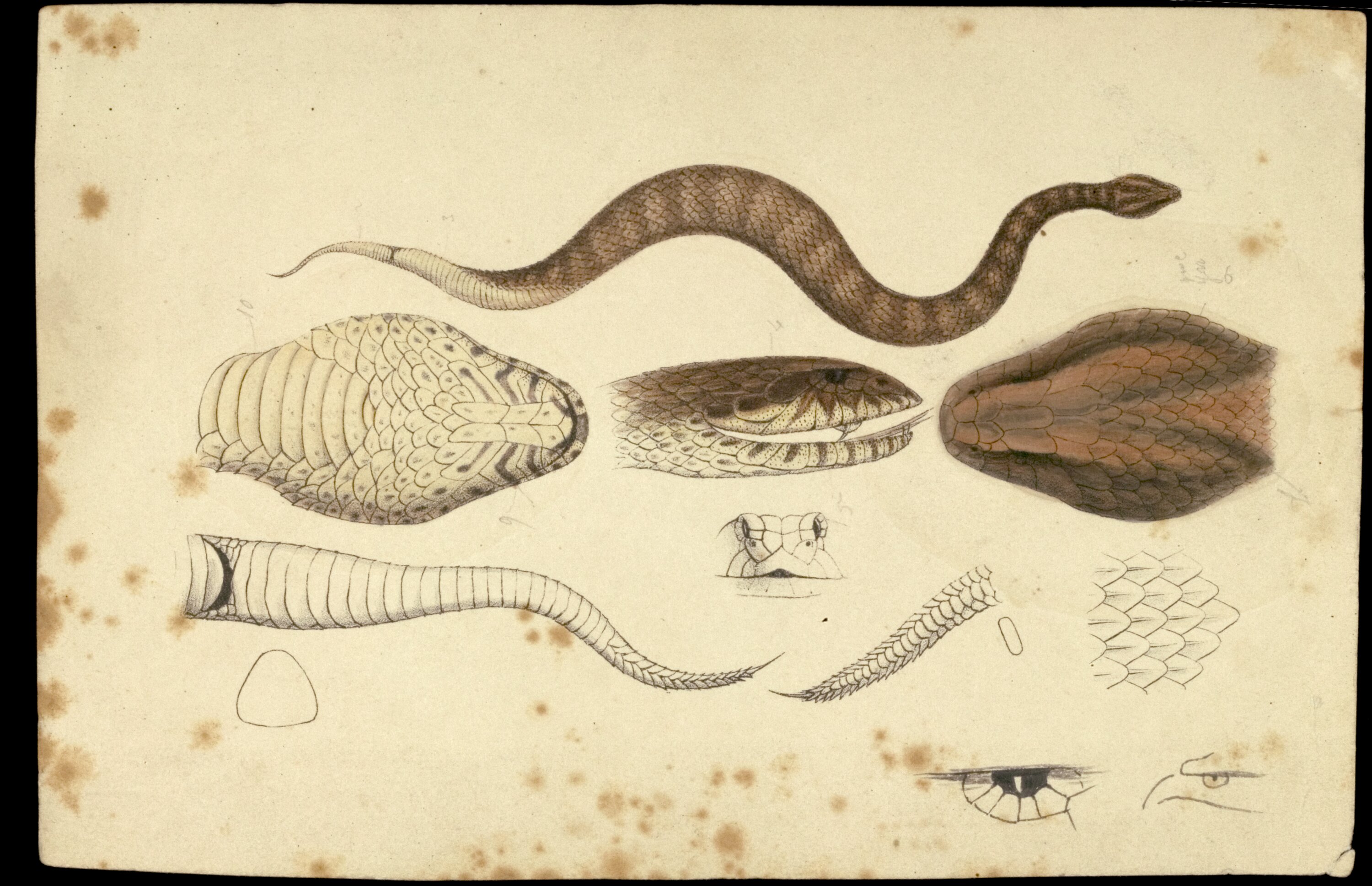 Lithographic hand coloured proof of a Death Adder, Acanthophis antarcticus, form near the Murray River, by Ludwig Becker for published Plate 12 of the Prodromus of the Zoology of Victoria by Frederick McCoy.
