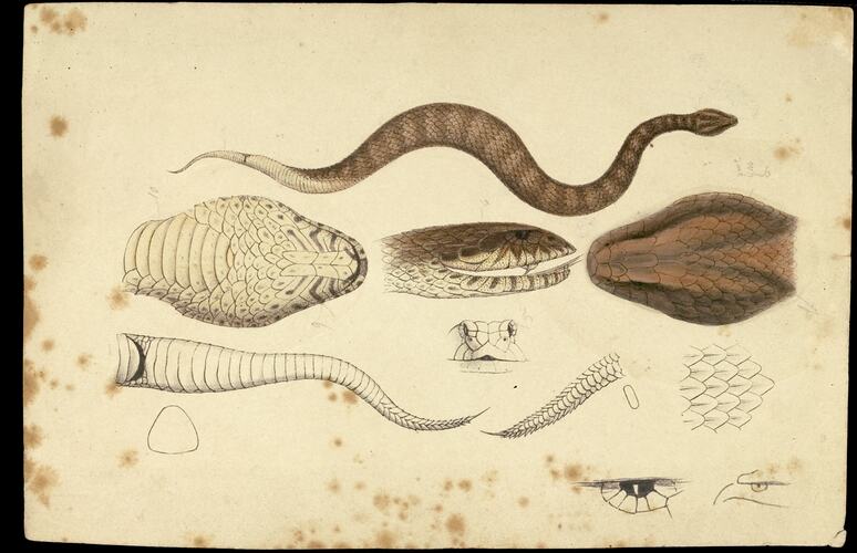 Death Adder, Acanthophis antarcticus by Ludwig Becker. Hand coloured proof, lithographic pencil and watercolour on paper, 15cm x 23cm. Published as Plate 12 in The Prodromus of the Zoology of Victoria by Frederick McCoy.